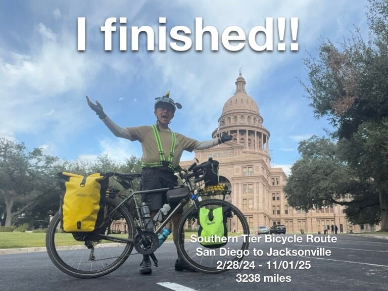 Day, 11/01/2025; 19 miles, 560 feet of climb I did it! I have FINISHED THE SOUTHERN TIER BICYCLE ROUTE!! It was an easier day than I expected, despite the headwinds…I think it was mostly downhill into Austin. I spent some…
