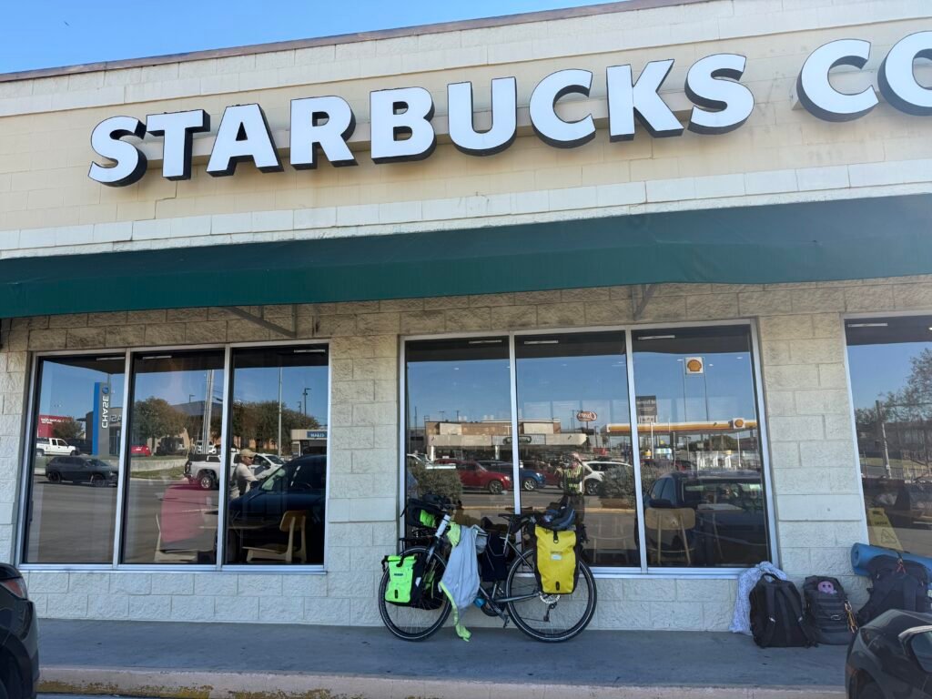 My first scheduled stop was a Starbucks after 20 miles. That’s the perfect distance to take a sit-down break. Dark roast coffee and a warm chocolate croissant are icing on the cake. This is the first time I’ve been to Starbucks on this entire trip.