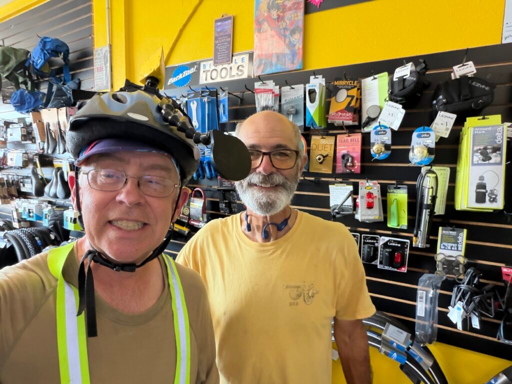 On the way to Nate‘s, I stopped at a different bike shop, Zen Bikes, to get a patch kit, because Nate didn’t have any. At Zen, I met a guy who had texted me a few days ago after meeting the Adventure Cycling group, Dan King! Dan is also bicycling the Southern Tier, and is going the same direction as I am.