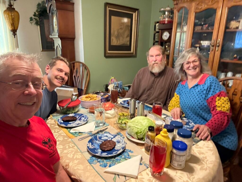 Gary cooked up some hamburgers with toasted buns. We also had broccoli and some ginger cream cookies for dessert that were sent by my wife with David from Iowa.