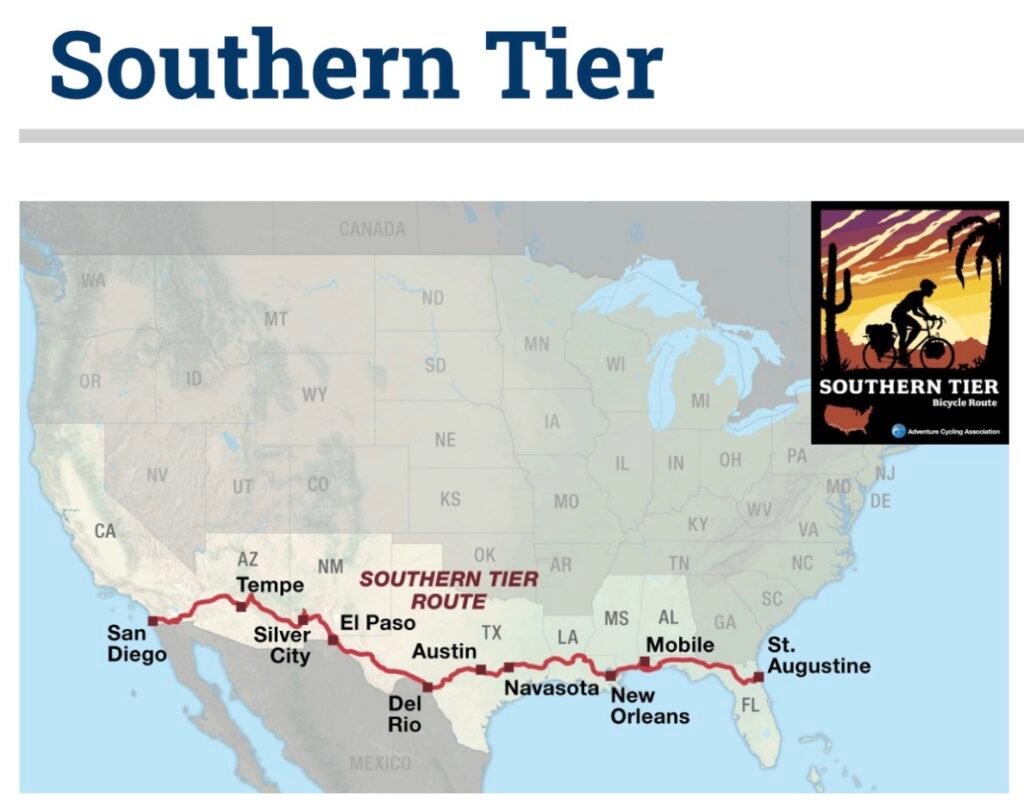 Okay, it is time to FINISH riding the Southern Tier Bicycle Route. This coast-to-coast route from the Adventure Cycling Association winds its way from San Diego to St. Augustine, Florida. I would love to ride the entire 3300 miles at one time, but my higher priority is staying happily married. So I decided to split it up into two sections.