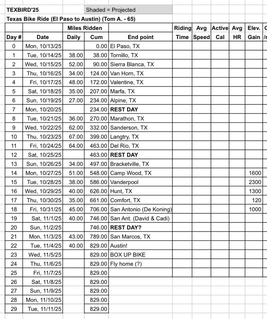 TRANSLATIONS/BACKGROUND: “TEXBIRD” = Texas Bike Ride, my own nickname for the 800 miles in the middle of Southern Tier Bicycle Route, from El Paso to Austin, using maps from ACA (Adventure Cycling Association). This will complete my ride of the Southern Tier from the Pacific Ocean (San Diego) to the Atlantic Ocean (Jacksonville). (I biked the 1500 miles from Austin to Jacksonville in March 2024, and the 1000 miles from San Diego to El Paso in February 2025.)