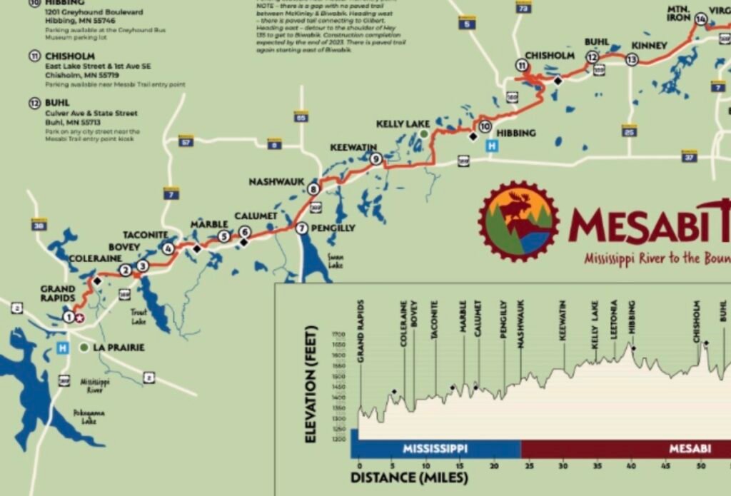 TRANSLATIONS/BACKGROUND: “Mesabi Trail” = a new paved, off-road bicycle trail in Northern Minnesota from the Mississippi River (Grand Rapids) to the Boundary Waters Canoe Area (Ely). For this trip, Beth and I are riding the 80 miles of the western half, from Grand Rapids to Eveleth. We hope to ride the eastern half next summer, when it should be finished all the way to Ely.