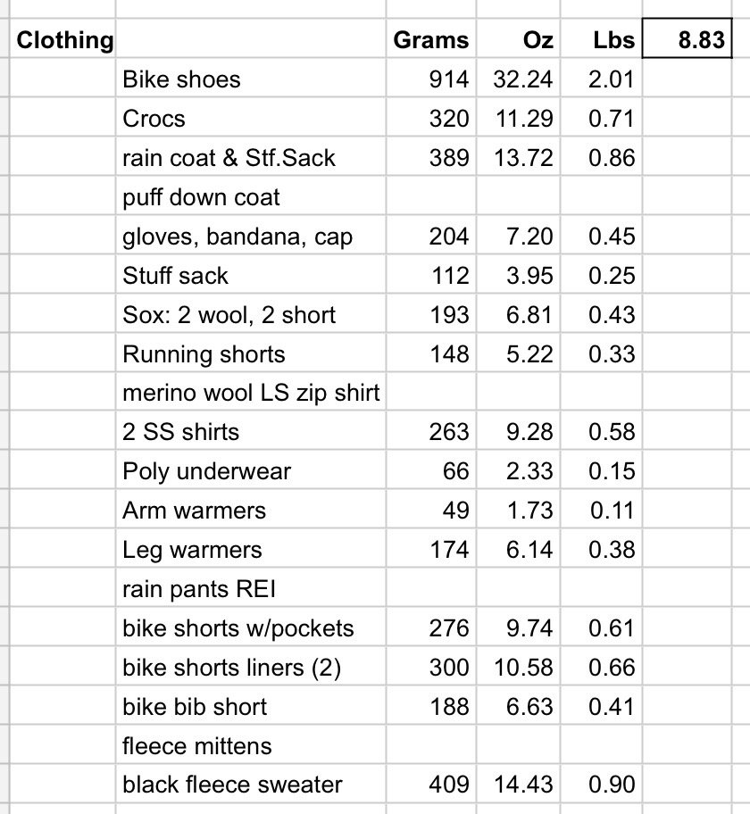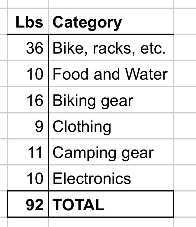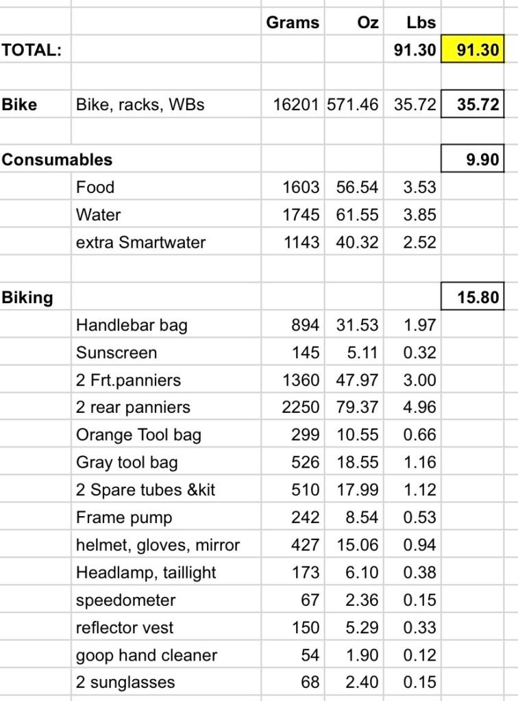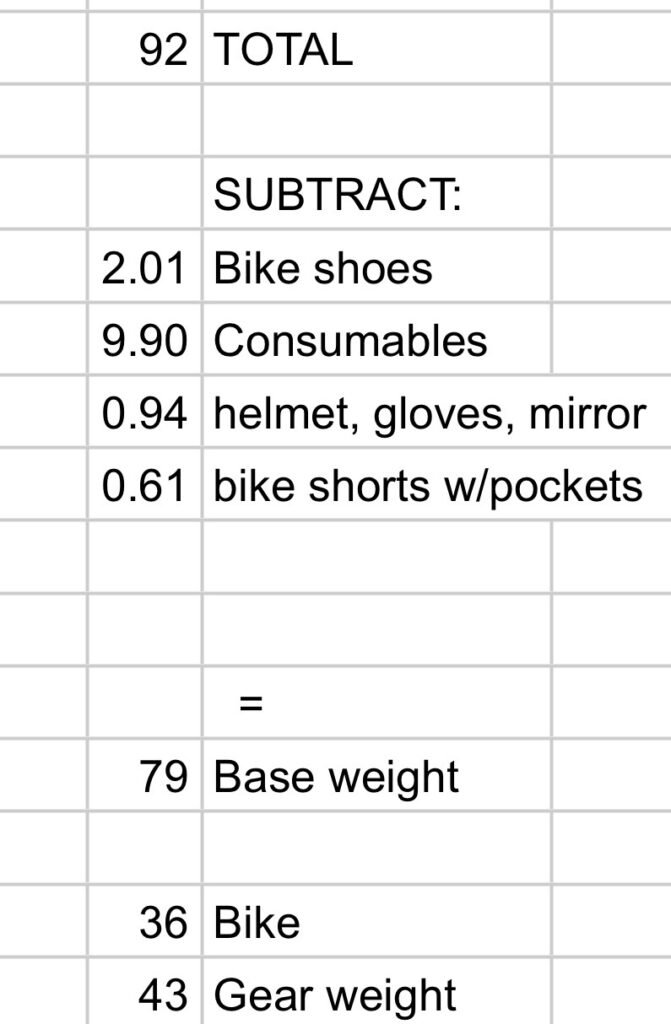My total weight (everything other than my body) is still pretty high at 92 pounds. But to compare that to backpacking, I should subtract the things I am wearing, like helmet, bike shoes, and clothes. If I also subtract consumables (food and water), then my “base weight” is 79 pounds.