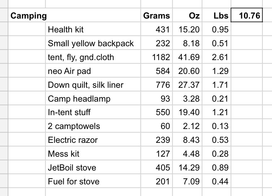 And if I subtract my bike, which is 36 pounds including the racks and heavier tires, then my actual gear weight is 43 pounds. That still seems high from a backpacking perspective, but I need to remember that 10 pounds of that is just electronics! This is a category that didn’t even exist when I started doing long bike trips in the 1970 and 80s.