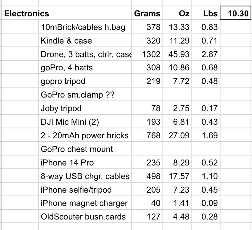 My Mini 4 Pro drone weighs only 6 ounces, but when you add the batteries, controller, carrying case, spare propellers, etc., it’s almost three pounds. But man, the footage from above can be EPIC! I am also carrying a Go-Pro on a tripod stick, and of course my cell phone, along with a lot of wires and a big charger and charging bricks.